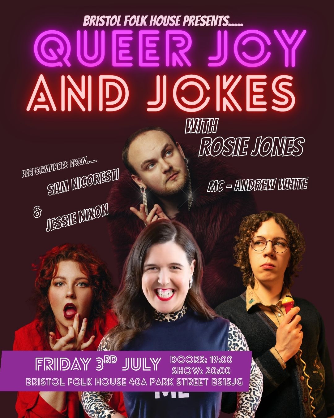 Join us for a night to celebrate queer joy with Rosie Jones, Jessie Nixon, Sam Nicoresti and MD Andrew White.